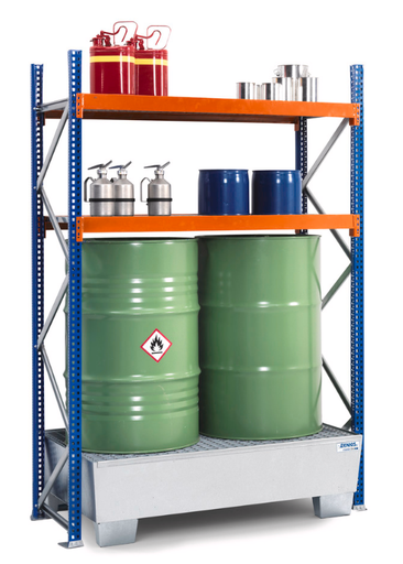 Dovoljeno za shranjevanje vnetljivih tekočin (H224-226) in vodi nevarnih snovi. Zbirni pladenj iz jekla z pocinkano rešetko.