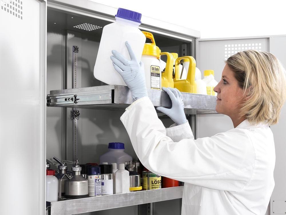 Omara za kemikalije Comfort CS 104-A iz jekla za varno in pravilno skladiščenje nevnetljivih tekočin in strupenih snovi v delovnih prostorih v skladu s TRGS 510.