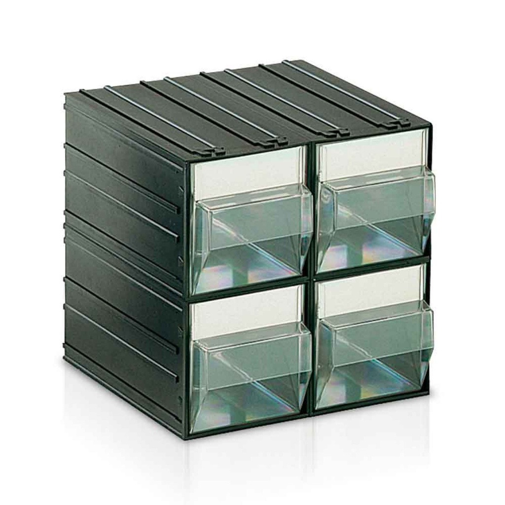 Predalnik iz črnega polistirena, odpornega na udarce, s 4 prozornimi predalčki z nalepko.