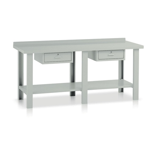 Delovna miza s površino iz kovine debeline 2,5 mm, 2 stranici, 1 ojačana spodnja polica in 2 drsna predala na vodilih s krogličnimi ležaji in zaklepanjem.